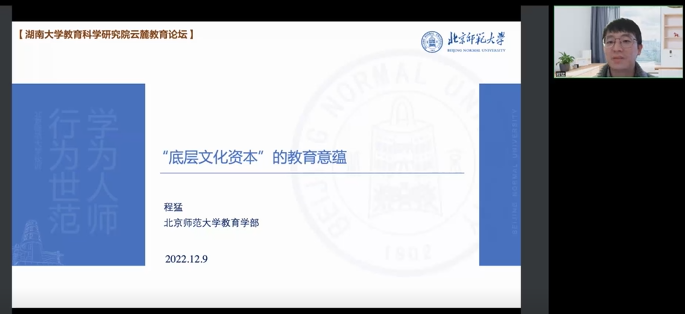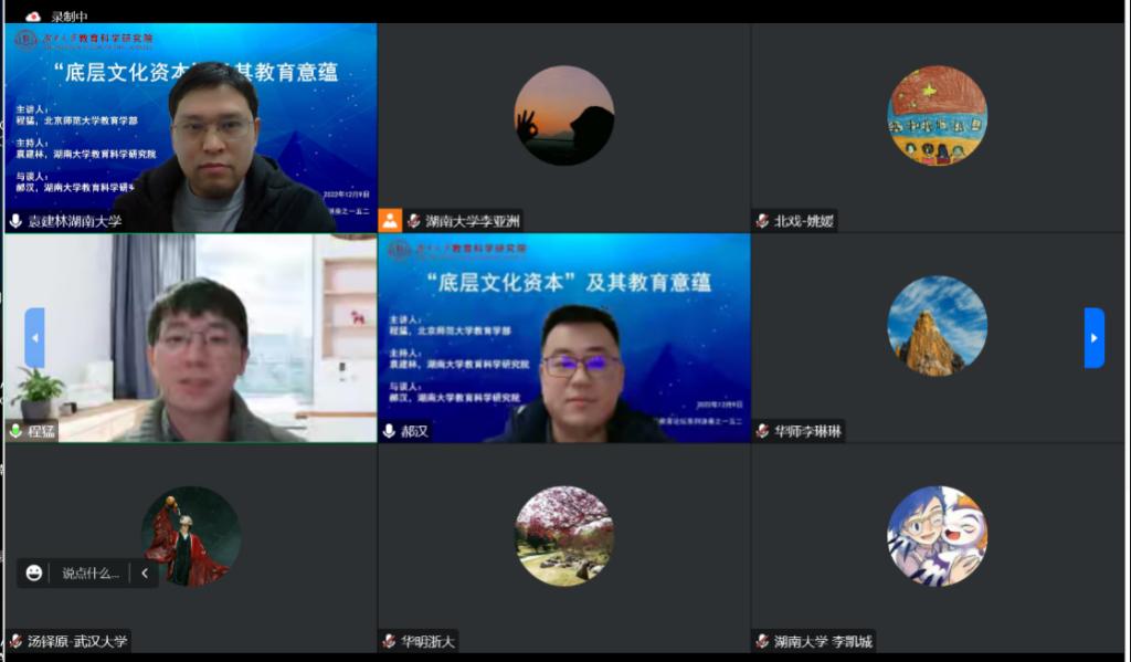 12月9日下午,我院云麓教育论坛系列讲座第152期在线举行,北京师范大学程猛老师以《“底层文化资本”及其教育意蕴》为题作分享,袁建林老师主持,郝汉老师与谈,超三百人线上参与,讲座气氛活跃、反响热烈。