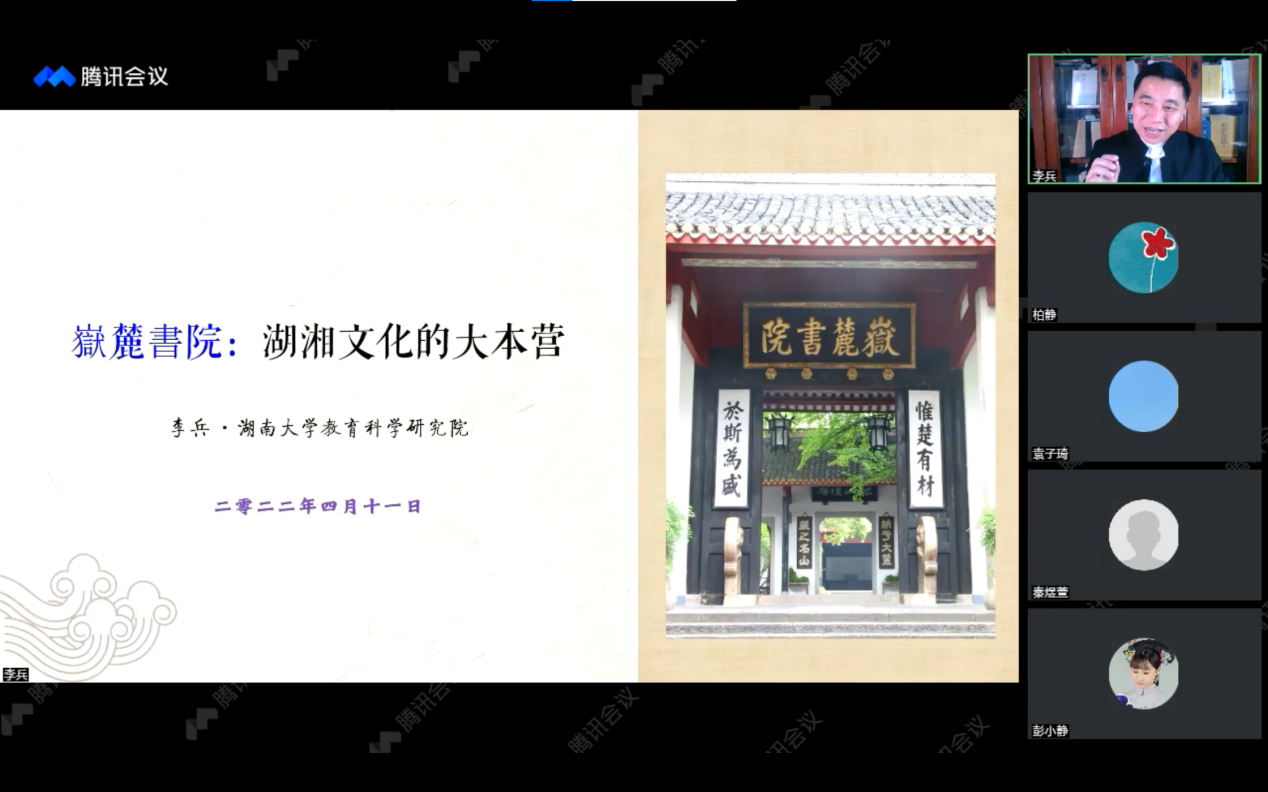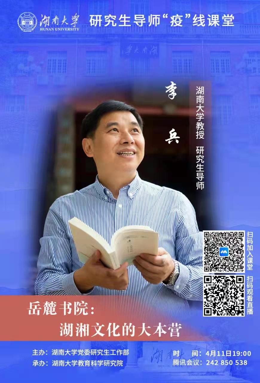 4月11日晚,英国上市官网365李兵教授做客研究生导师“疫”线课堂,以“岳麓书院:湖湘文化的大本营”为题作公开讲座。讲座持续2小时,近300名校内外师生在线观看,互动留言达百余条。