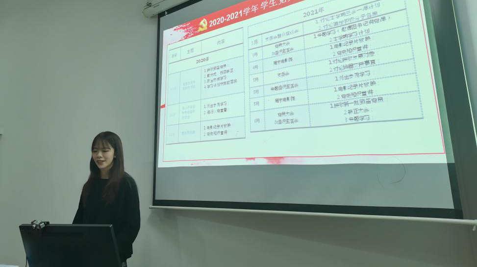 支部书记廖敏向大家汇报党员到场情况,随后进行接收预备党员会议的四项基本流程:第一,发展对象汇报思想情况;第二,入党介绍人介绍发展对象有关情况并表明意见;第三,支部委员会报告预审情况;第四,支部大会投票表决,荣方芳、张祎、唐雅伦、梅晗、孙晓画、路俊怡、舒霞玉、刘安琪等8名同学被接收为中共预备党员,戴安妮、杨菲两位中共预备党员按期转正。