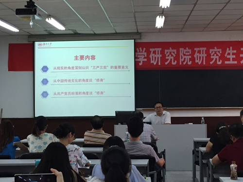 罗仲尤教授的报告共分三个部分:从现实的角度深刻认识“三严三实”的重要意义;从中国传统文化的角度谈“修身”;从共产党员标准的角度谈“修身”。他阐述了“三严三实”的科学内涵和根本要求,并强调:“三严三实”是党的建设理论的丰富与发展,“三严三实”是辩证统一的思想体系,“三严三实”有深厚的思想和实践基础,“三严三实”具有很强的现实针对性;践行“三严三实”是贯彻党的群众路线的内在要求,也是加强党的作风建设的迫切需要。