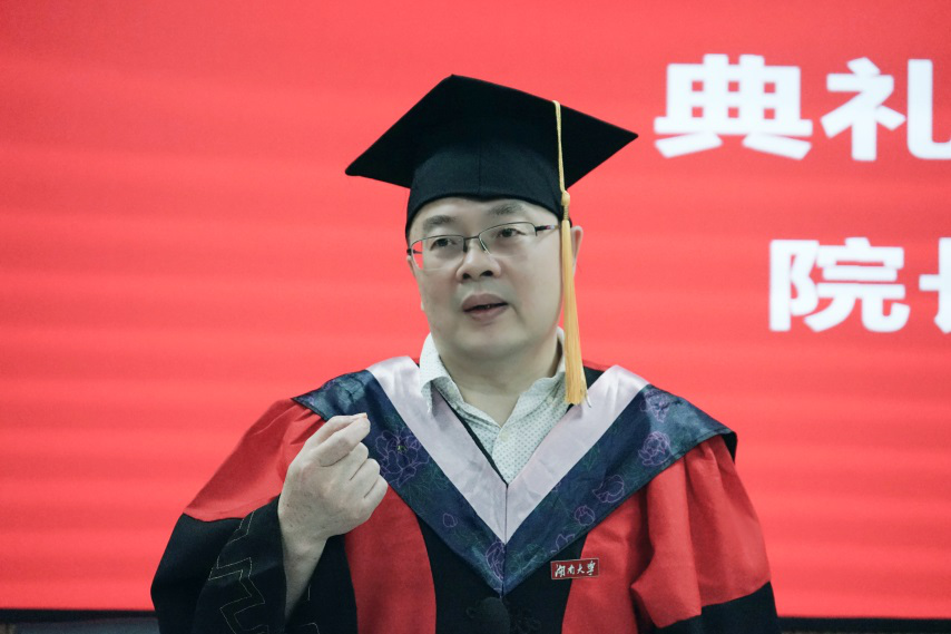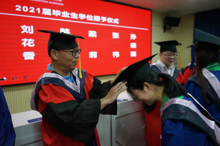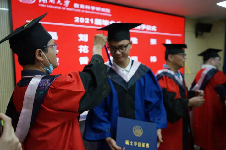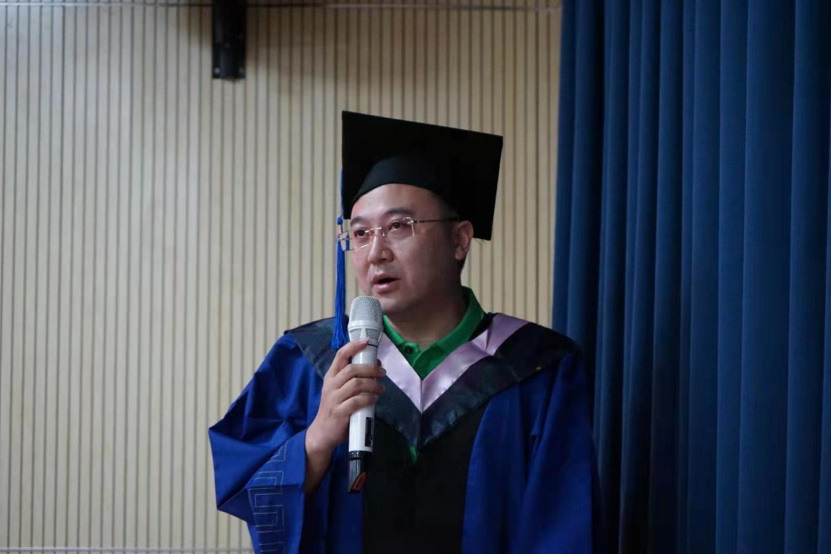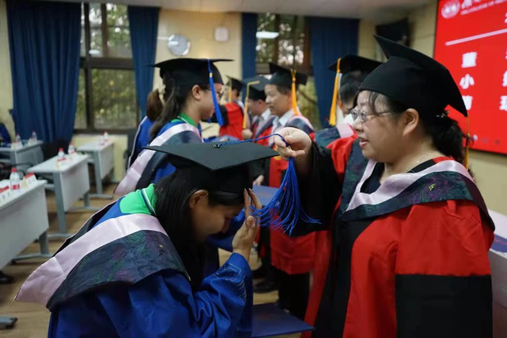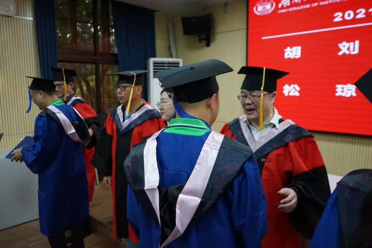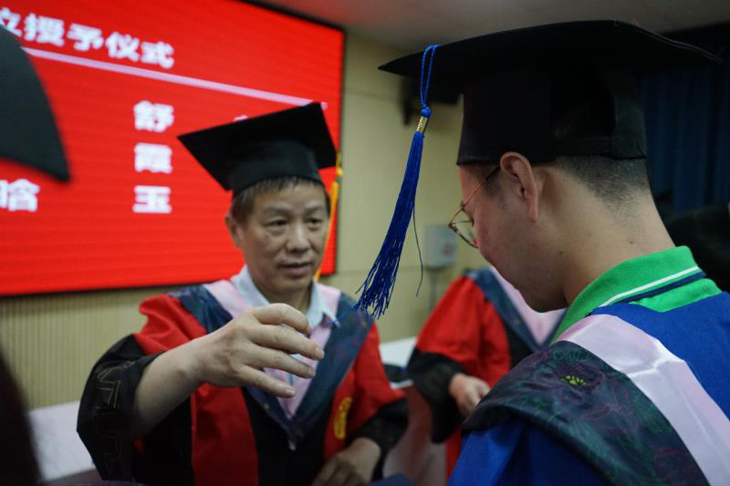 宣读完毕,毕业生们依次上台,由谢赤教授、余小波教授、姚利民教授、胡弼成教授、唐松林教授和蒋家琼教授为毕业生们正冠拨穗、颁发学位证书、赠院徽并合影留念。