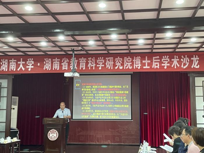 湖南省教科院周惠新博士后作了题为“健康中国战略的理论内涵与实践价值”的学术报告。他从理论来源、维度层面和特征三个方面介绍了健康中国战略的提出和发展历程,分析了这一战略提出的时代背景,并指出健康中国战略主要具有三点理论内涵和六大实践价值。
