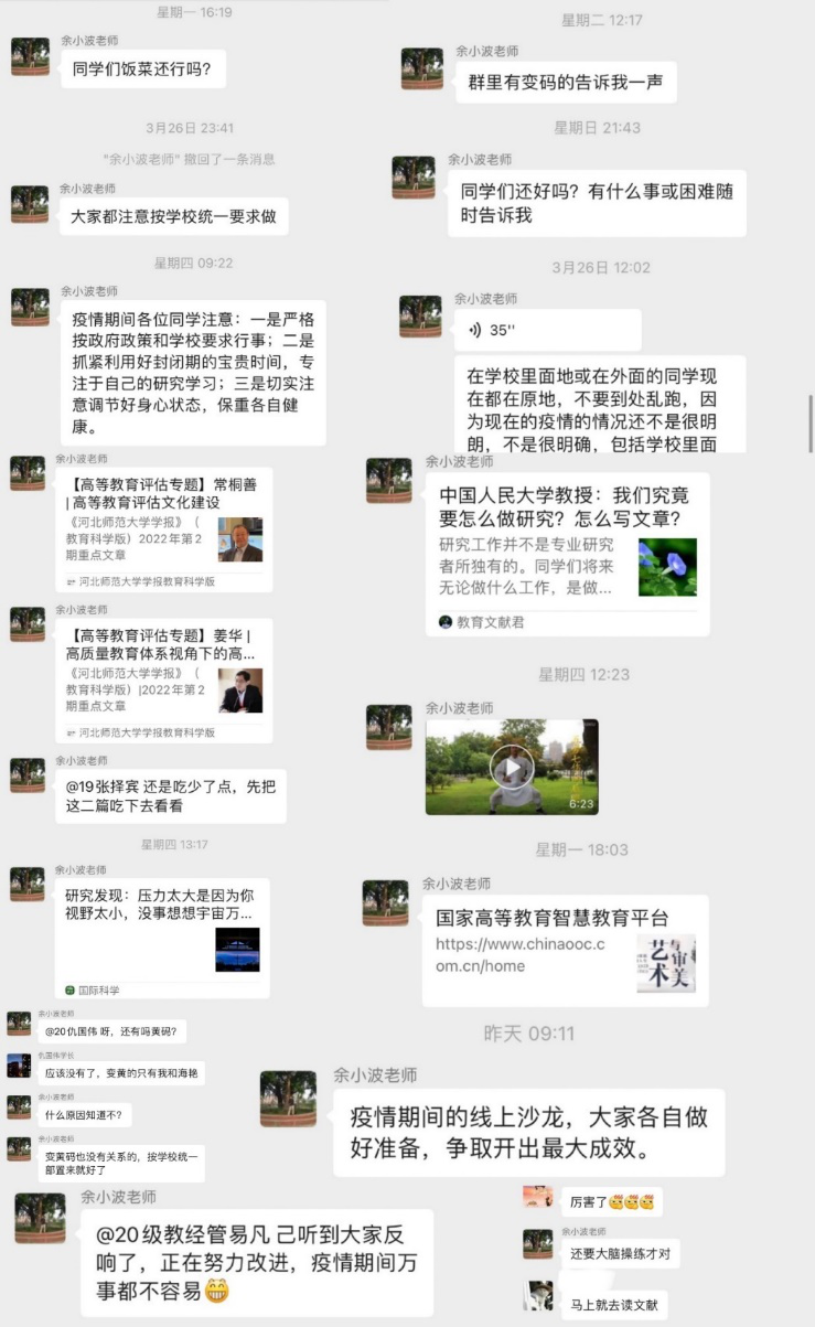 疫情发生以来,学校迅捷管控,主动作为。而在这成百上千的抗“疫”志愿者之中,少不了余小波教授的学生身影。封闭在寝室或隔离酒店的这些日子,同学们按照学校学院的通知精神,在导师的敦促下,展示出了“严格落实要求、全面科学防控、践行文明理念、养成良好生活习惯”的应有之态。