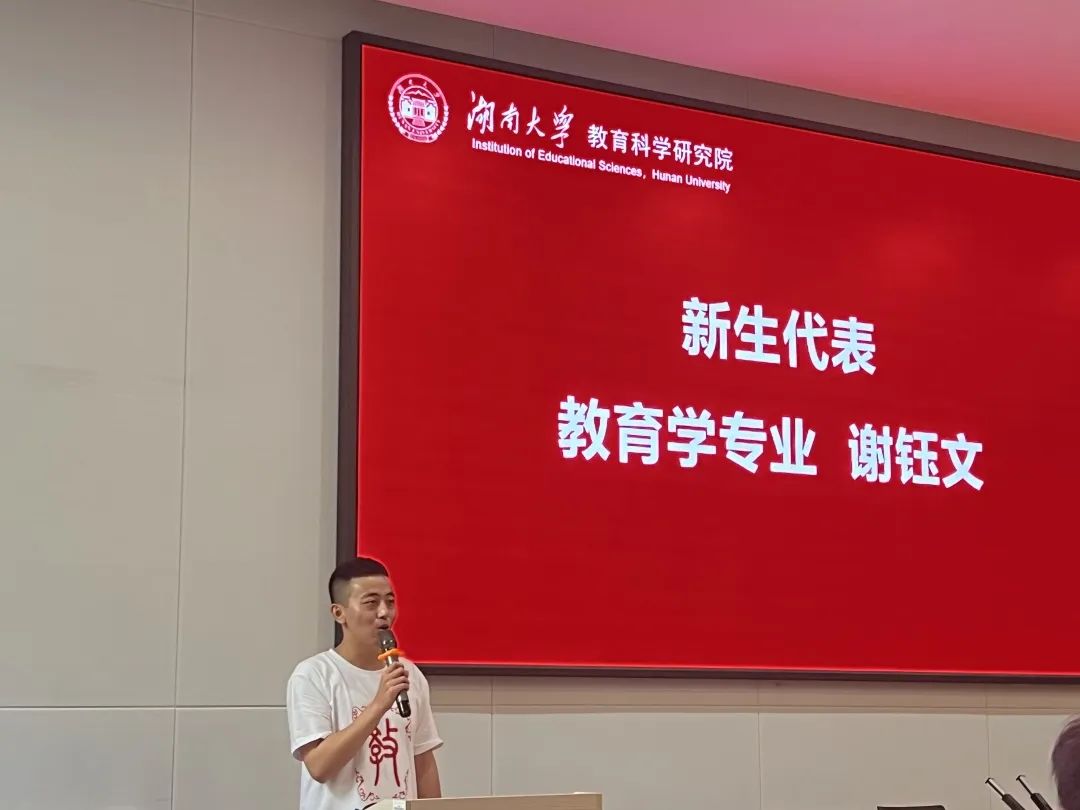 2022级教育学专业谢钰文同学表达了成为一名“湖大人”的骄傲与自豪。表示要继承湖大“惟楚有才,于斯为盛”的文脉和精神,在湖大认真学习并书写新的篇章,提升自我,成为一名优秀的教育研究者、成为一名优秀的湖大人。