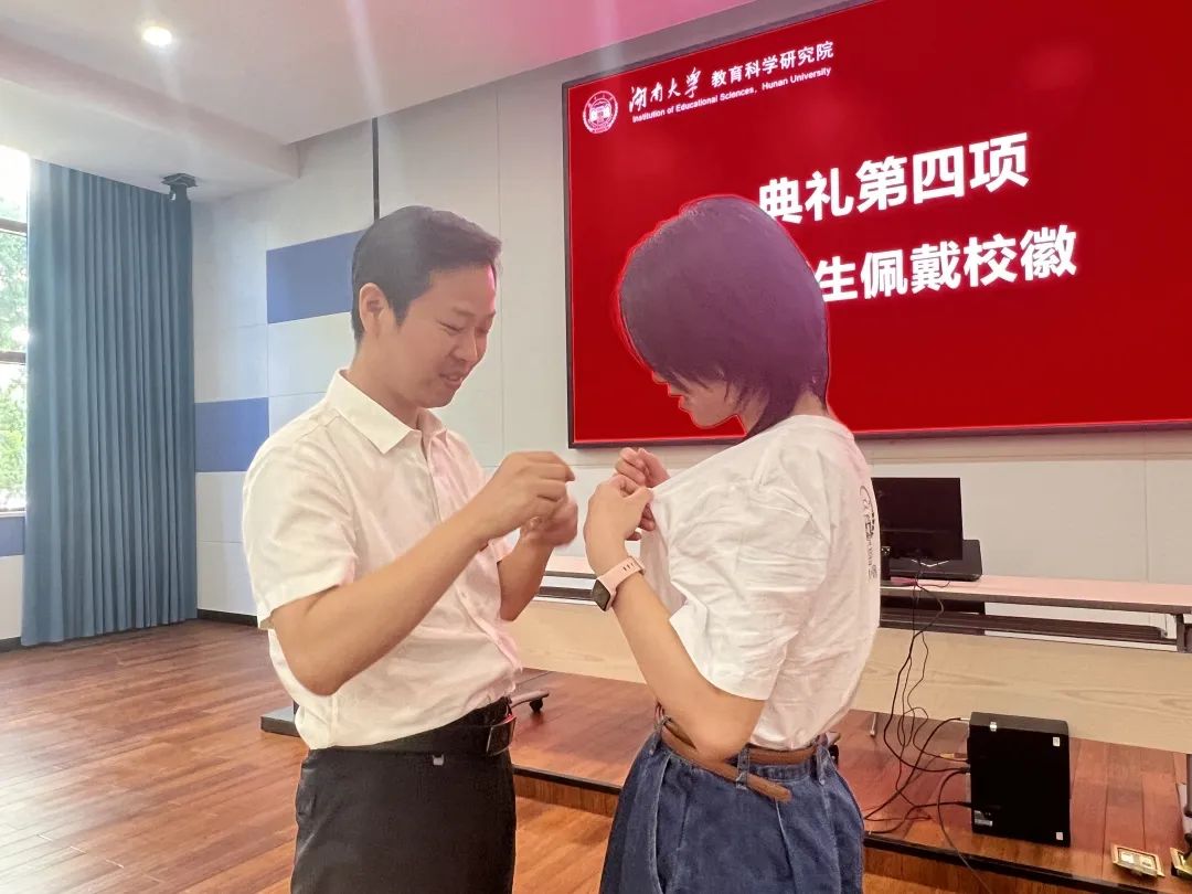 佩戴校徽环节中,阳征书记为新生代表谭小薇同学佩戴校徽,其他同学互相佩戴校徽。