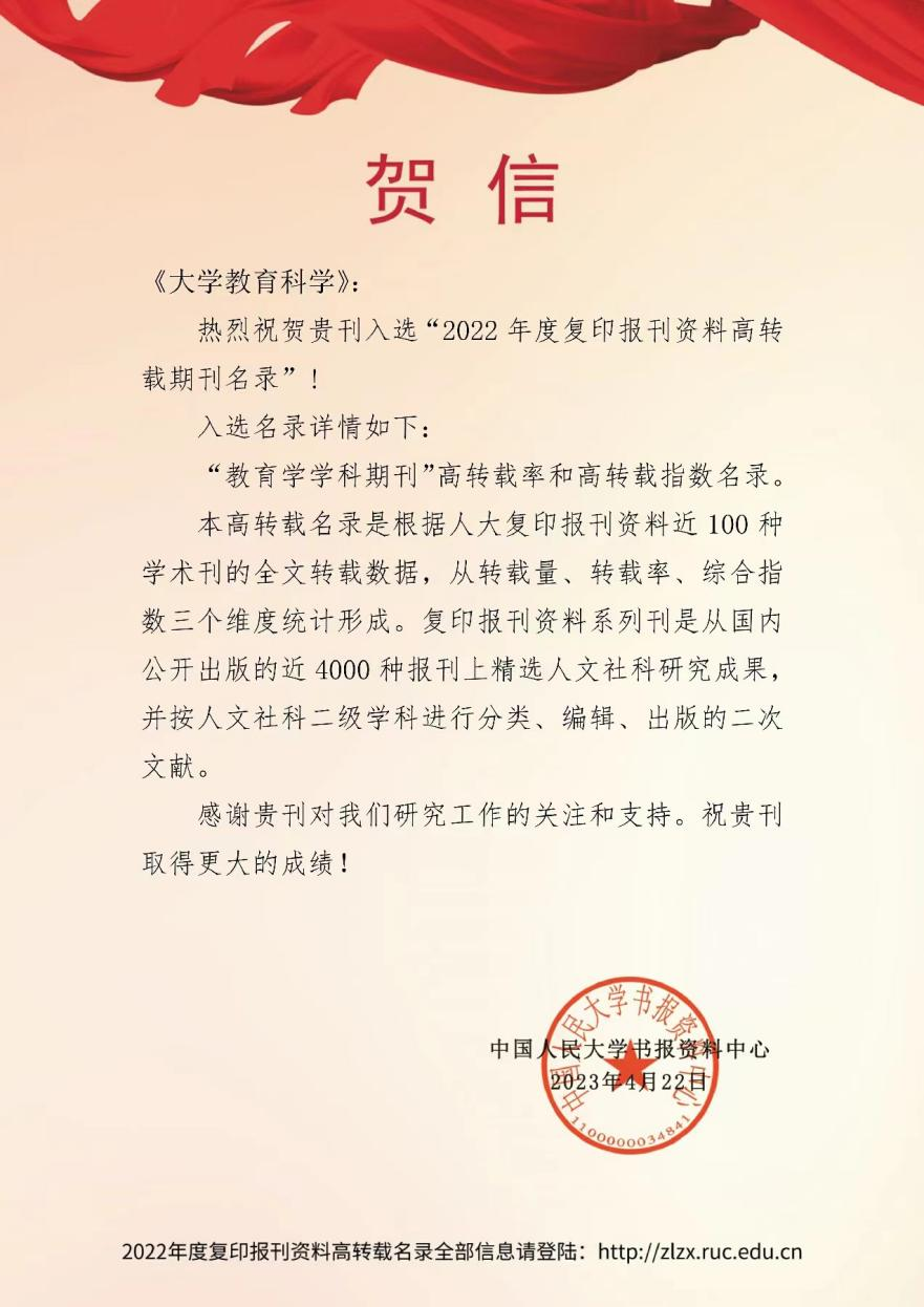 中国人民大学书报资料中心此前公布“2022年度复印报刊资料高转载期刊名录”,《大学教育科学》杂志成功入选“教育学学科期刊”高转载率和高转载指数名录。