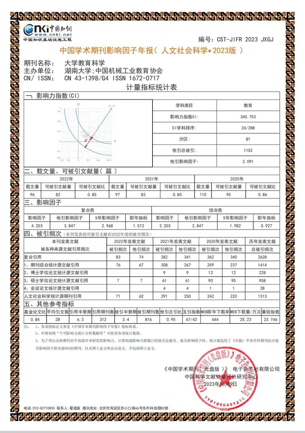 近日,《中国学术期刊(光盘版)》电子杂志社有限公司、中国科学文献计量评价研究中心发布《中国学术期刊影响因子年报(人文社会科学·2023版)》,我院《大学教育科学》影响力指数(CI)在全国教育类288种期刊中排名第26位(2022年在289种教育类期刊中排名第40位);2023年该刊复合影响因子4.203,增幅40.57%;综合影响因子3.203,增幅27.00%。近年来,该刊影响力指数持续提升,受关注度显著提高。