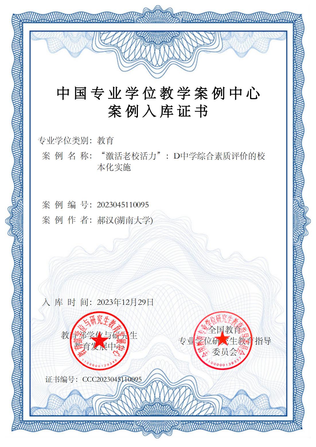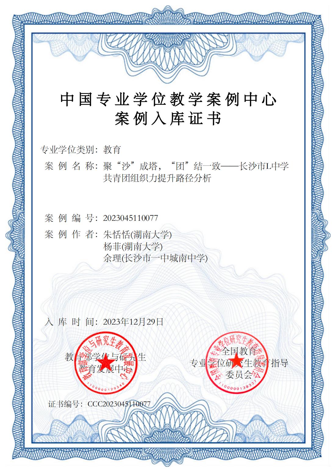 近日,教育部学位与研究生教育发展中心发布了2023年全国教育专业学位教学案例中心案例入库证书。此次全国教育专业学位教学案例共征集700 多篇教学案例,经全国教育专业学位研究生教育指导委员会组织专家进行初审、初评和终评,湖南省共有6个教学案例通过最终评审。我院申报的3个教学案例均通过最终评审,朱恬恬副教授与杨菲和余理合作编写的《聚“沙”成塔,“团”结一致——长沙市L中学共青团组织力提升路径分析》、袁建林副教授编写的《“菜单式”研训——需求导向的小学青年教师校本培训新模式》、郝汉助理教授编写的《“激活老校活力”:D中学综合素质评价的校本化实施》教学案例成功入选全国教育专业学位教学案例中心。