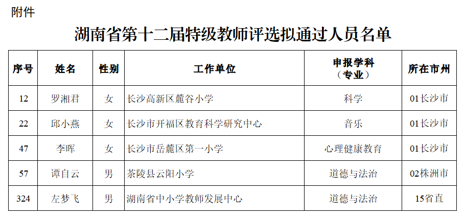 近日,湖南省教育厅官网发布《湖南省第十二届特级教师评选拟通过人员公示》,我院院友长沙高新区麓谷小学罗湘君、长沙市开福区教育科学研究中心邱小燕、长沙市岳麓区第一小学李晖、茶陵县云阳小学谭自云、湖南省中小学教师发展中心左梦飞获评湖南省特级教师。