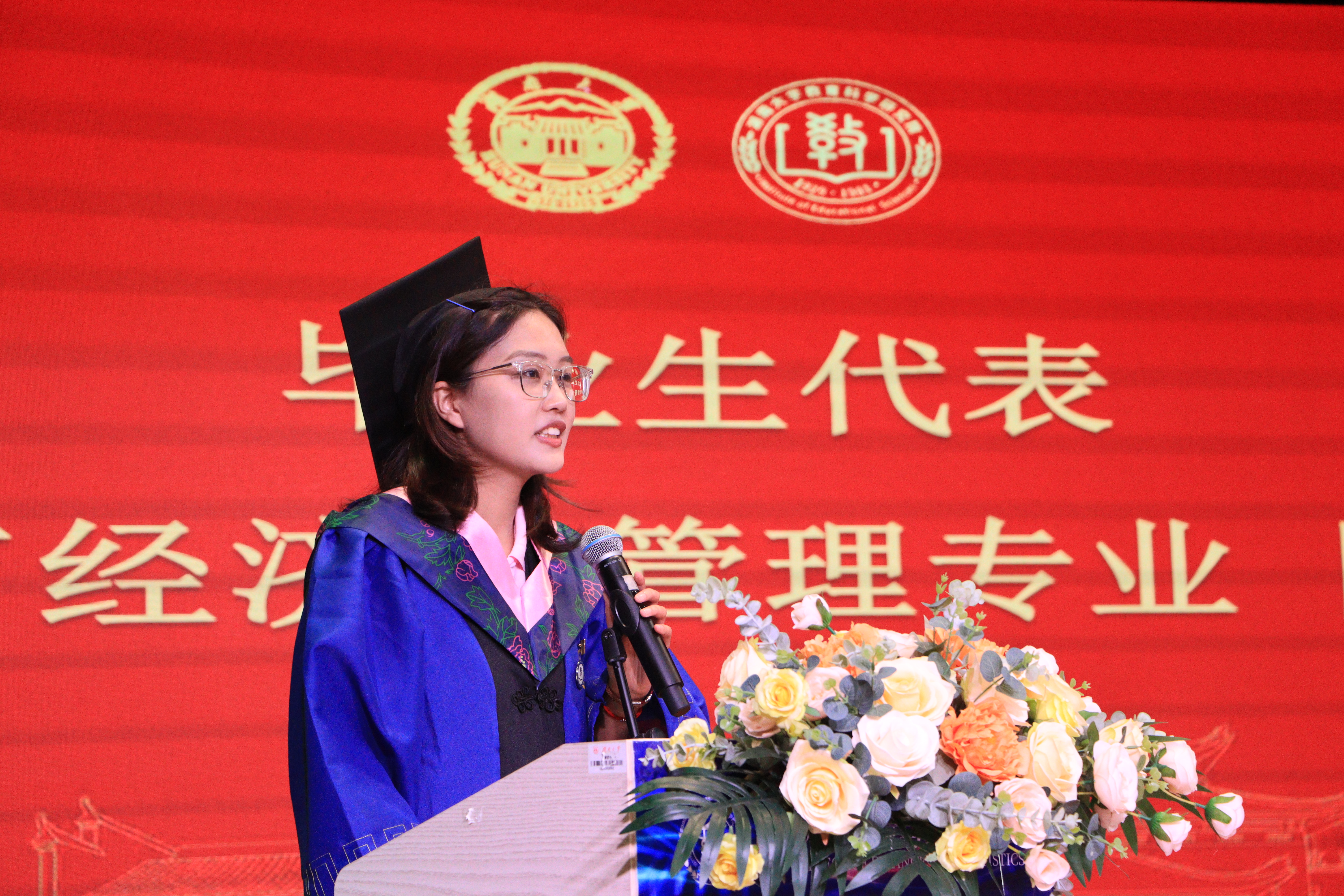 我是2021级公共管理专业的陈思,非常荣幸可以作为毕业生代表在这里发言。一晃三年,时光荏苒,我们终于迎来了毕业典礼。此刻,我的心中既有即将毕业的喜悦,同时也有对湖大教科院深深的不舍。教科院的三年,使我蜕变了很多。感谢教科院的每一位老师,正因为有你们的谆谆教导,才有了我现在的成长。感谢教科院的每一位小伙伴们,有了你们,我的硕士三年才能如此多彩。