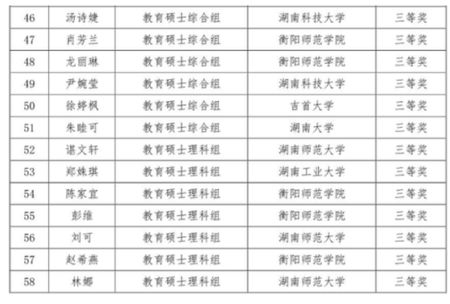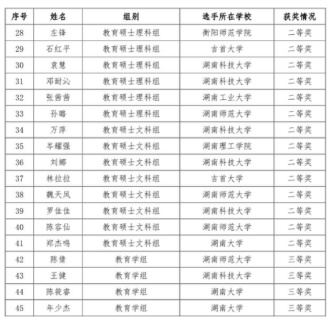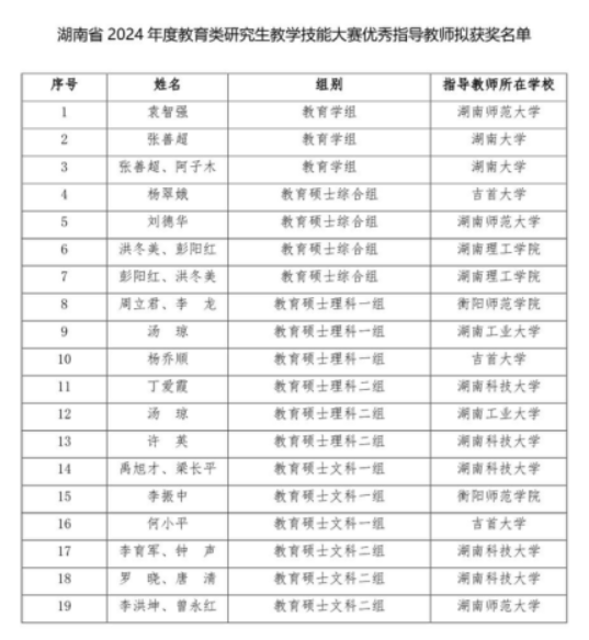 近日,湖南省教育厅公布了湖南省2024年度教育类研究生教学技能大赛竞赛结果,我院教育学专业研究生李佳仪、向琳芳获一等奖,陈筱睿、年少杰获三等奖,教育管理专业研究生朱睦可获三等奖,张善超、阿子木老师获“优秀指导教师”(获奖名单如下)。