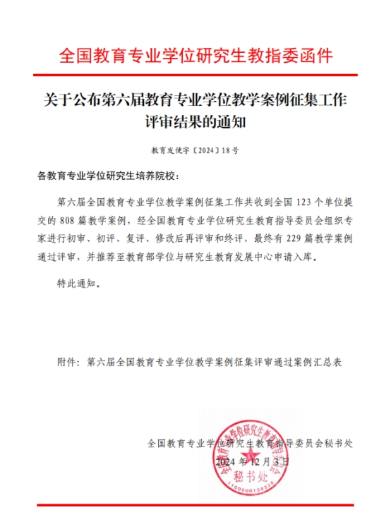 近年来,我院始终将案例教学与案例建设工作置于重要地位,持续加大对入选各级案例库案例的指导与支持力度。不仅多次组织教学案例专题打磨会,还特邀专家针对教学案例的优化改进给予精准化指导。本年度,我院新增三篇教学案例成功入选全国教育专业学位教学案例中心,这是继去年三篇案例入选后的又一次重大突破,彰显了我院教学成果与理念在国家级教学案例中心的持续认可度,也为后续教学案例撰写工作积累了丰富且宝贵的经验。