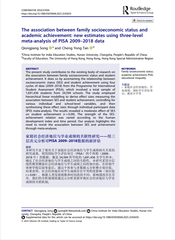 近日,我院宋琼将老师与香港大学教育学院合作的研究在国别与比较教育研究领域取得新进展。该研究以 “The association between family socioeconomic status and academic achievement: new estimates using three-level meta-analysis of PISA 2009–2018 data”为题,发表于比较教育学领域权威期刊《Comparative Education》。