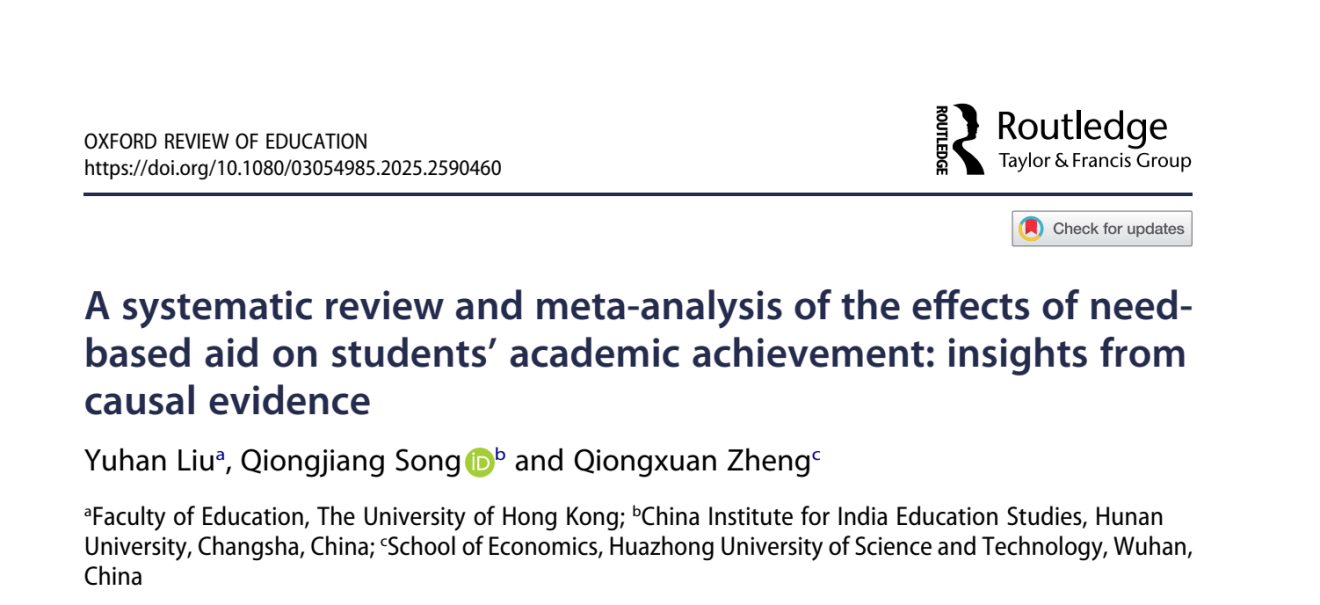 近日,我院宋琼将老师研究成果《A systematic review and meta-analysis of the effects of need-based aid on students’ academic achievement: Insights from causal evidence》在国际权威期刊《Oxford Review of Education》 发表。