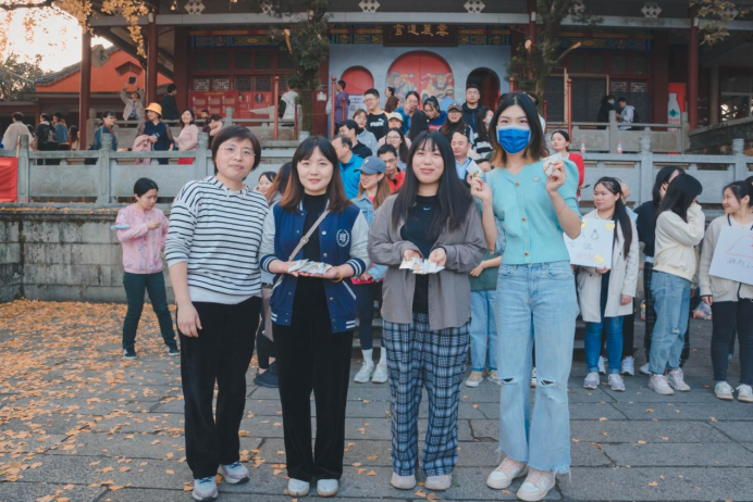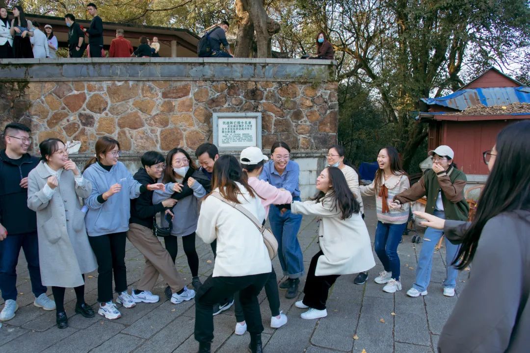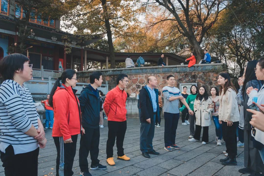 师生们到达第二个关卡白鹤泉后,工作人员协作拍摄趣味动作团队照片。手挽手、创意俯视等姿势提高了活动趣味性,队员们在合作中增强了对彼此的信任,也提高了团队的凝聚力。最后“战无不胜所向披靡队”率先到达第三个关卡云麓宫,其他队伍紧随其后。