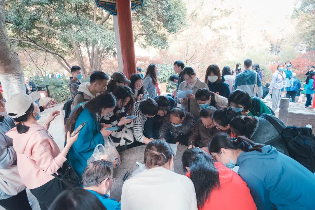 到达第一个关卡爱晚亭后,满目红枫,秋意正浓。老师同学们积极参与四史、校史、院史知识答题,不仅丰富了知识储备,也增进了团队间的配合与默契。