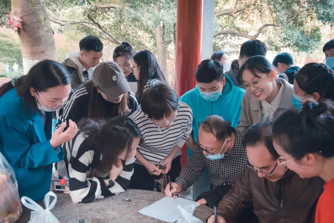 活动伊始,师生于东方红广场抽签分组、制作队牌并合影。合影结束后,各队分别出发,秋阳正好,师生沿着山路,探讨学术,畅聊生活,一路向上。欢笑声此起彼伏,给秋日的岳麓山带来了一片生机与活力。