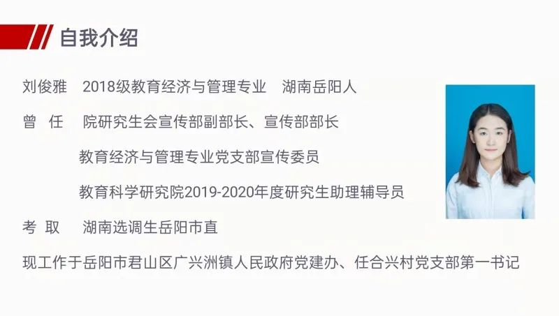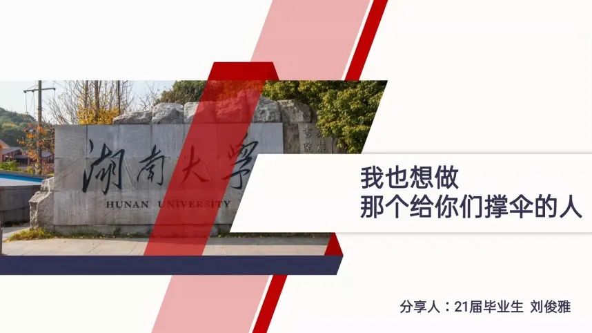 现就职于岳阳市君山区广兴洲镇人民政府的2021届毕业生刘俊雅以“我也想做那个给你们撑伞的人”为主题展开分享。她回顾了研究生期间的学习经历、英国365经历和求职经历,重点介绍了湖南省选调生的报考情况与备考经验,展示了基层工作内容与体会,建议大家视野要开阔、想法要落地、准备要周全、心态要良好,并祝“每一个披星戴月的夜晚都能听到答案”!