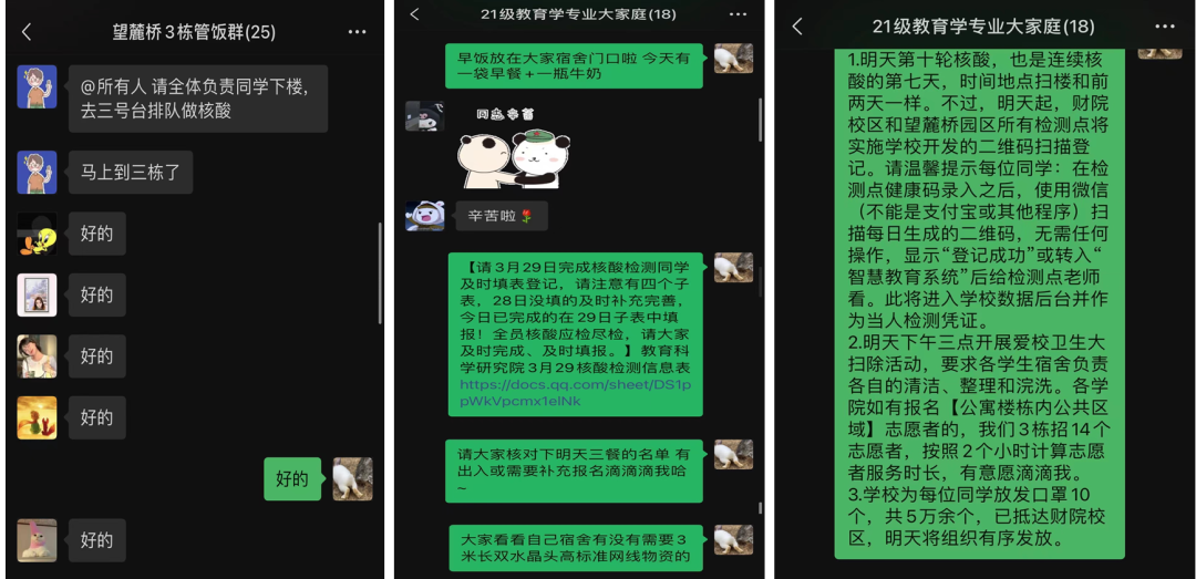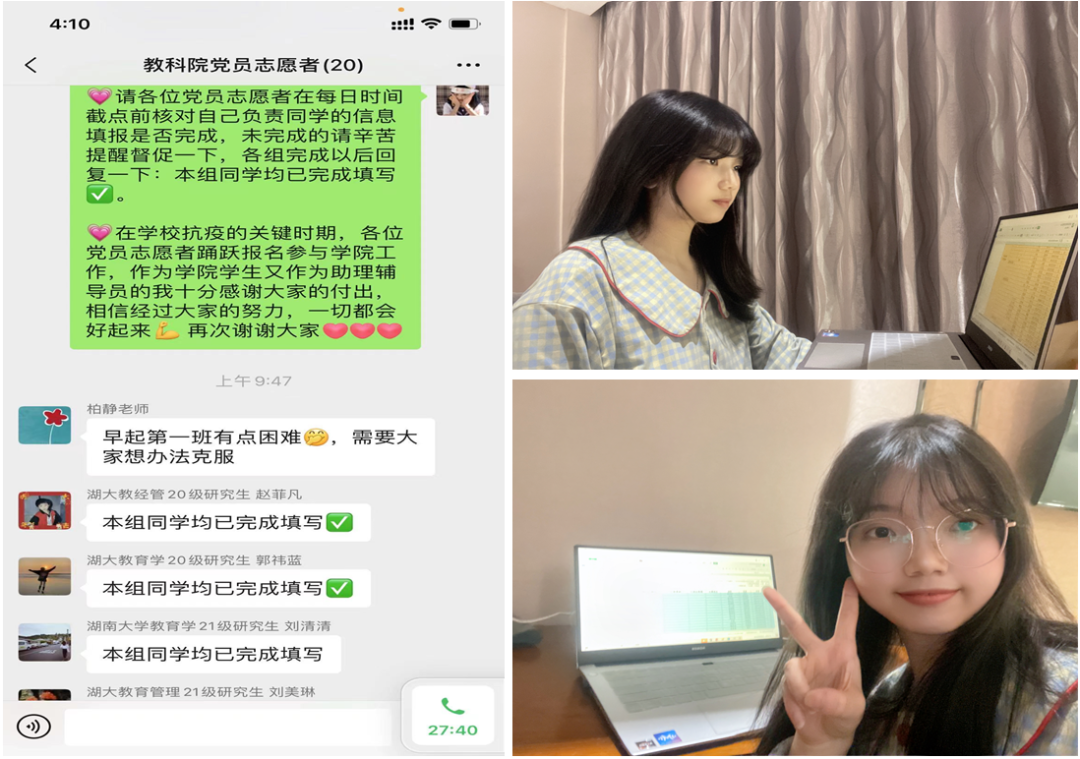 “疫情封校期间,我的工作内容主要包括线上处理学生数据,处理学生所在地、核酸检测等信息,上报学校数据等。这段时间,党、政府、学校和老师们都特别关心大家的身心健康,导师也每天问候大家的学习和生活。能作为一名助理辅导员,参与管理疫情期间的事务,为学院尽自己的微薄之力,我还是很开心。同时我也认识到疫情期间更需要大家同心协力,志愿者和工作人员真的太辛苦了,我们只能做好本身的工作。希望大家一起努力,渡过难关。”