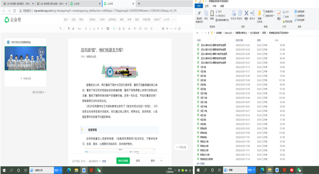 “2021年7月-2022年1月期间,我一直在学工部管理办负责本科生疫情防控工作,与校办校医院沟通联动,同22个本科学院辅导员对接本科生疫情相关数据,后因学工版块重新划分转到学业科。3月长沙疫情突发,我重新加入了疫情防控队伍,协助办公室老师做好每日数据4报(3次发校领导的信息和1次详细表格)。我的工作内容主要包括:1.协助汇总收集处理疫情防控重要数据,包括隔离人数、变码人数、身体异常情况学生情况等;2.参与撰写发布疫情防控有关工作方案和工作通知,及时督促提醒学院完成相关工作,保障工作顺利、有序、平稳推进;3.完成疫情防控期间班主任队伍宣传推文,包括文稿撰写、素材收集。展现班主任在疫情防控期间奋战一线、关心关爱学生的优秀事迹。