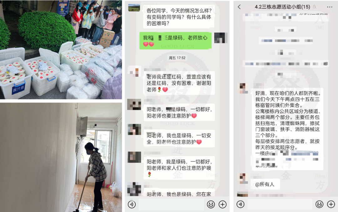 为了贡献自己的一份力量,我报名参加了志愿送饭服务。每天不等的点餐数量和阴雨连绵的天气,3月底的那几天属实难熬。在食堂、送餐员和无数志愿者的一次次努力下,我们将热腾腾的早饭、午饭和晚饭准时送到同学们的手中。学院和导师都会每天关心大家的学习生活状态;不同院系的同学们会经常宿舍楼群中寒暄;宿舍的同学们从刚开始的不适应到现在能一起学习和一起运动,我想这段时间的封校的这段时间让大家彼此的内心距离更近了。在这段时间中除此以外,我还报名参加了宿舍楼层大扫除的志愿活动。虽然只是扫、拖地,清理蜘蛛网和擦拭门窗玻璃,但是我想在这紧张的疫情防控下应该也分担了楼层打扫阿姨的负担吧。