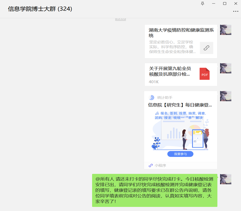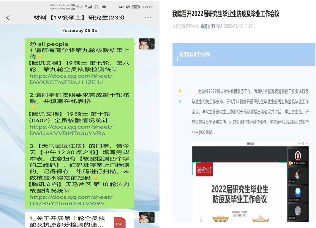 “在长沙出现疫情之时,作为助理辅导员的我多次深入各楼栋宿舍向各年级同学传达学校疫情防控要求,叮嘱同学们非极其不必要不离校,但是在学校划分为管控区的第二天凌晨四点,我以次密接者和时空交集者被转运到酒店集中隔离,这是我离疫情最近的一次,自此我与专职辅导员开始了线上的工作交流。健康打卡、核酸检测统计、体温统计、信息报送成了日常防疫的常态化工作;挨个与校外住宿学生、未返校学生、红黄码等不同状态的学生保持联系和沟通成了我确保知悉和充分掌握学院每名研究生具体情况的主要任务。与此同时,借助线上会议向学生传达疫情形势及相关注意事项,利用学生疫情防控期间学习生活健康指南,充分发挥班级班长、导师团队联络人、党员志愿者等各类学生干部坚实力量,形成层层督导的防疫机制,保证了学院防疫工作的顺利展开。