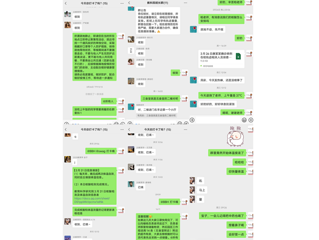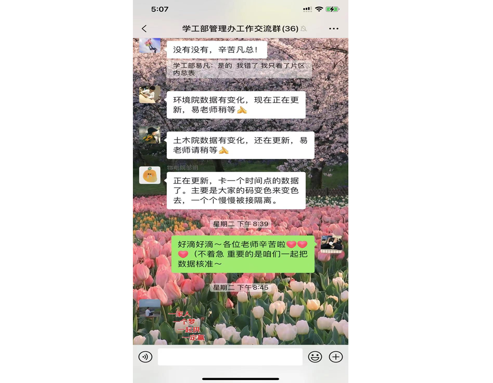 疫情是一场无硝烟的战斗,如果说每个学生都在保持着对战状态,那么辅导员一定是在‘疯狂’战斗ING。作为助理辅导员,我们需要全天候待命,工作时间已经不分今天是否值班、是否上下班,每天都需要督促同学们每日打卡、量体温、做核酸等,工作难度不大但需要落细落实,特别是对学生的信息统计需要反复核查,确保无误。疫情最难的时候,熬夜已是常态,但正是在这样紧张的工作中,我和学生们的感情更加亲近了,也明白了如何改进和优化自己的工作方式,收获颇多。”