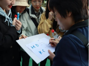 各队抵达热情沙滩进行“你划我猜”游戏,“双阳开泰”队一马当先,“八仙过海”小跑而来,其他队伍紧随其后。各队齐心协力、默契满满,由两位同学手脚并用生动比划,其余成员一同猜词。现场气氛热烈,师生们脑洞大开、频出奇招、欢声连连,以最快速度完成了闯关任务。