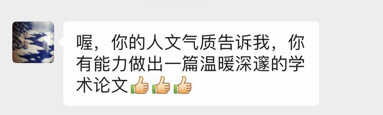 记忆中,这三年来,从初次汇报小论文的写作思路,到毕业论文终稿落定,我的导师一直都是在言语中传递着鼓励和肯定,这给予了我莫大的自信和温暖。早几日,在与师门好友畅谈时,就提及了曾经在我感到自己面临心理困境的时候,是唐老师读书沙龙上的几句话点醒了我,只是随口寥寥数语,并不对事,也不知情,偶然之间却也足以使我豁然开朗。诸如此类的,日日积累,耳濡目染,逐渐学会了与自己和解,与这个世界和解,做一个心中有爱的人。
